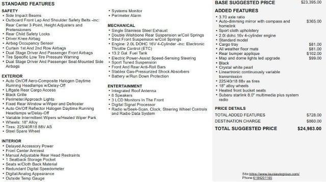 - Radio: Subaru Starlink 8.0" Multimedia Plus System -inc: AM/FM stereo, HD Radio, single disc CD player, MP3/WMA/CRR/RW file capability, multi touch gesture high resolution 8.0" LCD display screen, voice activated controls, Bluetooth® audio streaming connectivity, Bluetooth® hands-free phone connectivity, Bluetooth® hands-free text messaging connectivity, Near Field Communication (NFC), iPod control capability, rear vision camera, SiriusXM All Access radio (subscription required), SiriusXM Travel Link (subscription required), smartphone integration, AHA, Android Auto, CarPlay, Pandora, Starlink Cloud applications: bestparking, calendar, Glympse, iHeart radio, Magellan Navi, music player, news, Stitcher, weather, Yelp, dual USB ports, 3.5mm auxiliary input jack, 6 speakers and roof mounted, audio/satellite and connected services antenna and off delay operation StarLink enrollment cannot be applicable to Fleet Management Companies (FMCs) or to Commercial fleet accounts at this time.